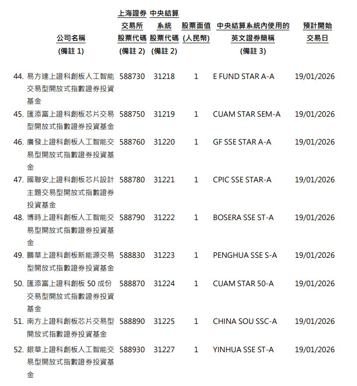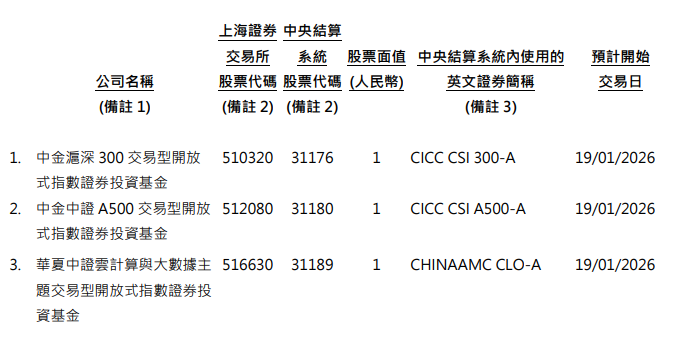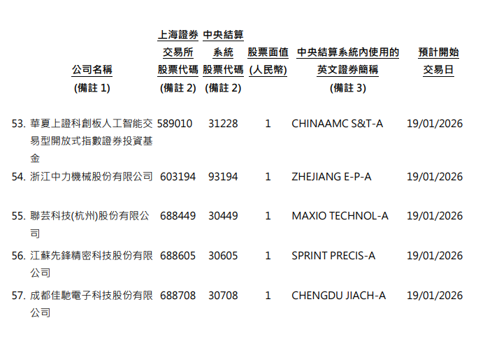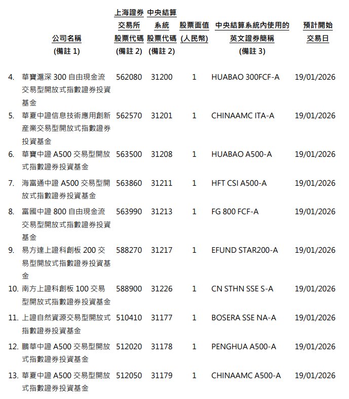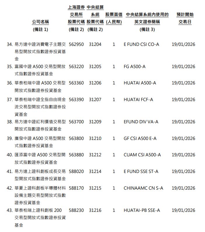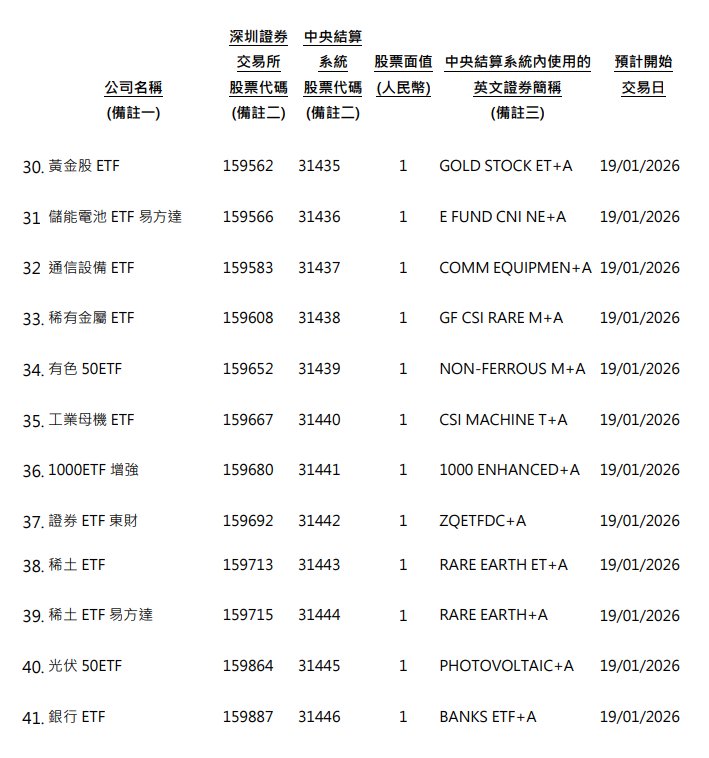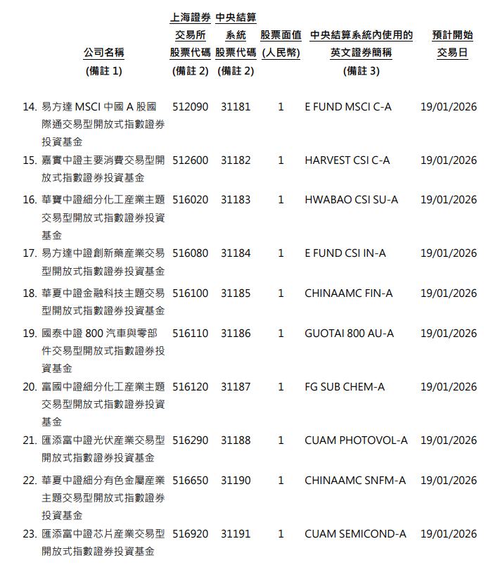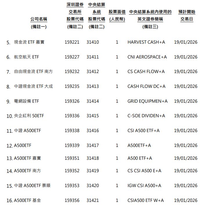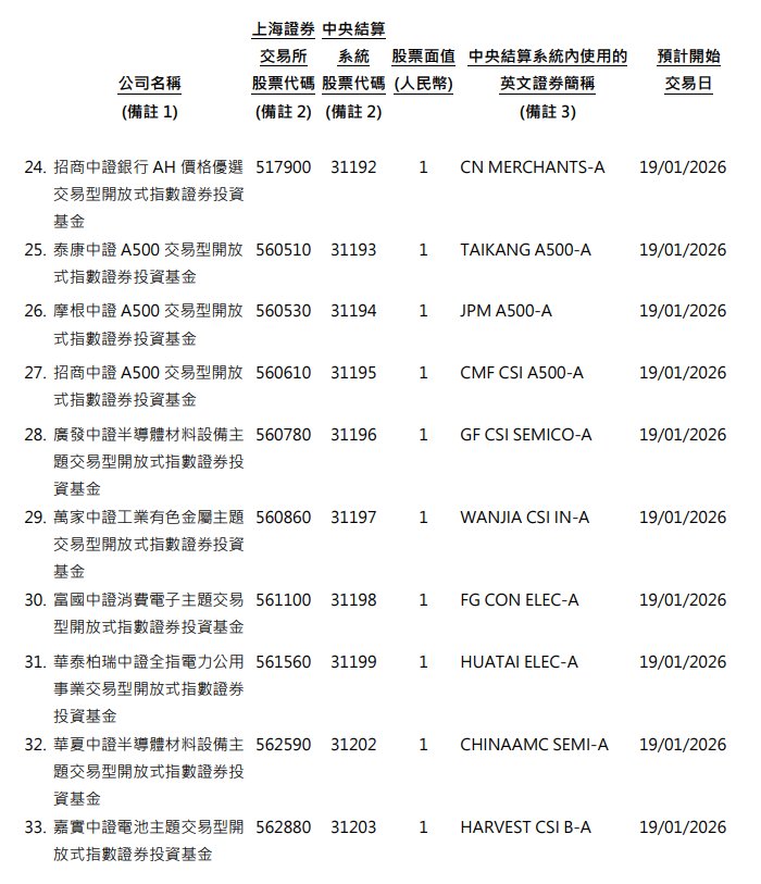 1月14日,港交所发布公告称,沪深300ETF中金(510320)、A500ETF中金(512080)等共53只基金和中力股份(603194)(603194.SH)、联芸科技(688449.SH)等野心4只股票获纳入沪股通名单,解放现款流ETF(159201)、创业板ETF东财(159205)等共43只基金和海安集团(001233)(001233.SZ)、中国铀业(001280)(001280.SZ)共3只股票获纳入深股通。以上变动2026年1月19日顺利。