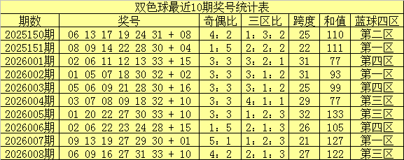 南华天第2026009期双色球区间号码个数统计分析:(红球:01-11为一区,12-22为二区,23-33为三区;蓝球:01-04为一区,05-08为二区,09-12为三区,13-16为四区)